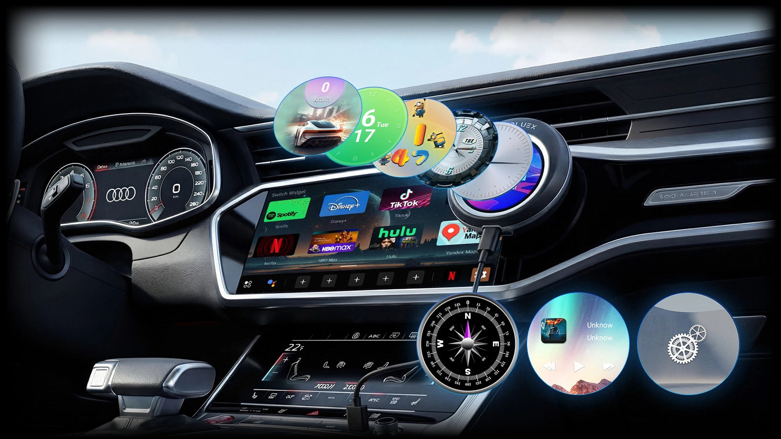 - Outputs video and audio to an external display or compatible in-car screen.
